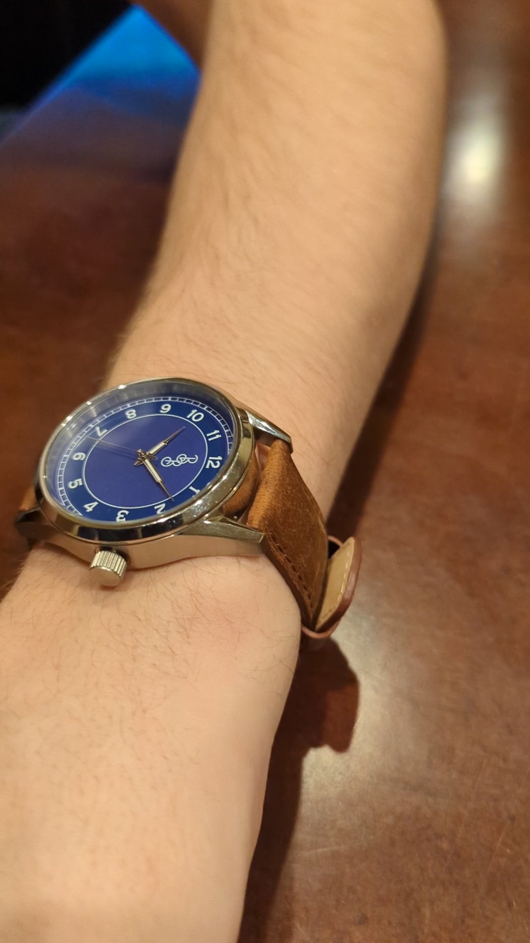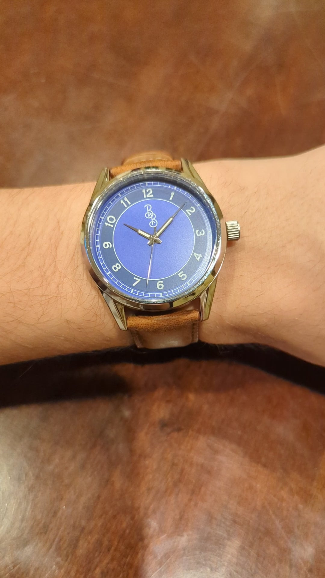 Choose your strap/bracelet: Choose from Brown Leather, Blue Silicone, or Stainless Steel.