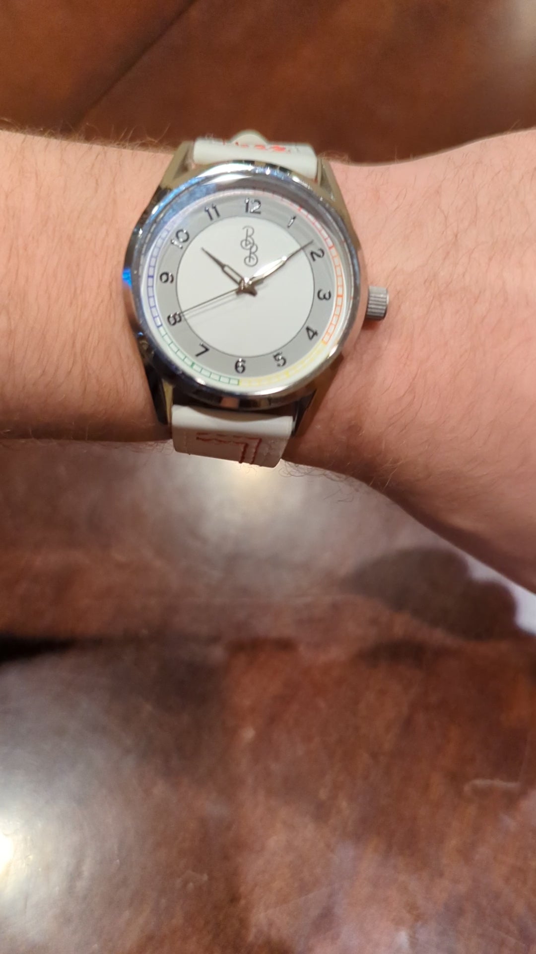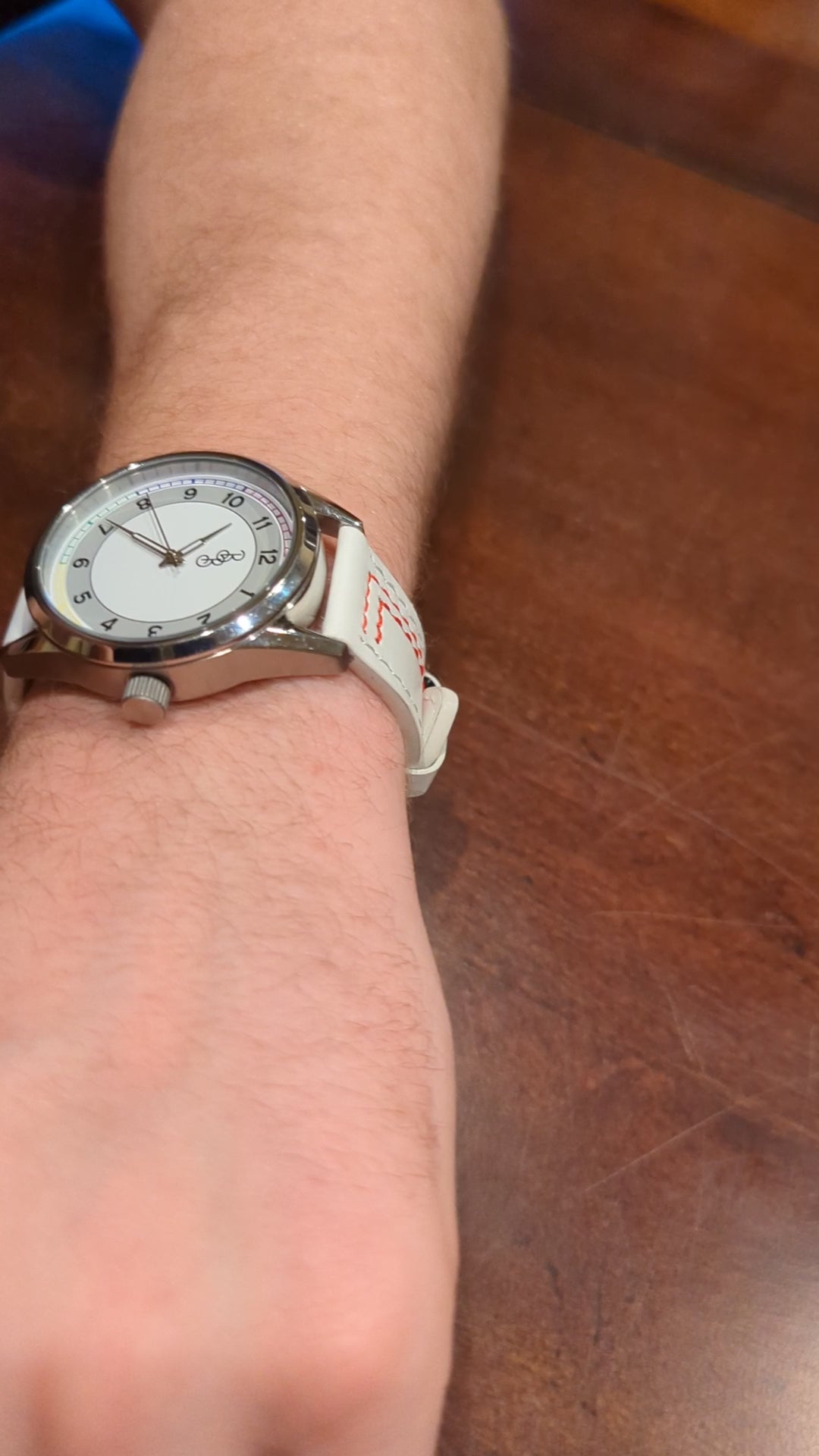 Choose your strap/bracelet: Choose from a White Leather strap with Red Stitching, Red Silicone, Blue Silicone, or Stainless Steel.